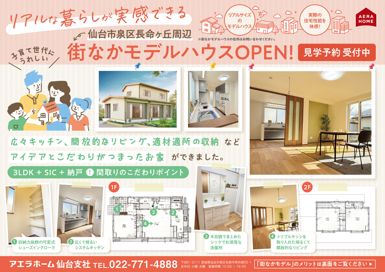 | お問合せ先 | アエラホーム仙台北店/仙台東店 TEL. 022-771-4888 sendaikita@aerahome.co.jp |